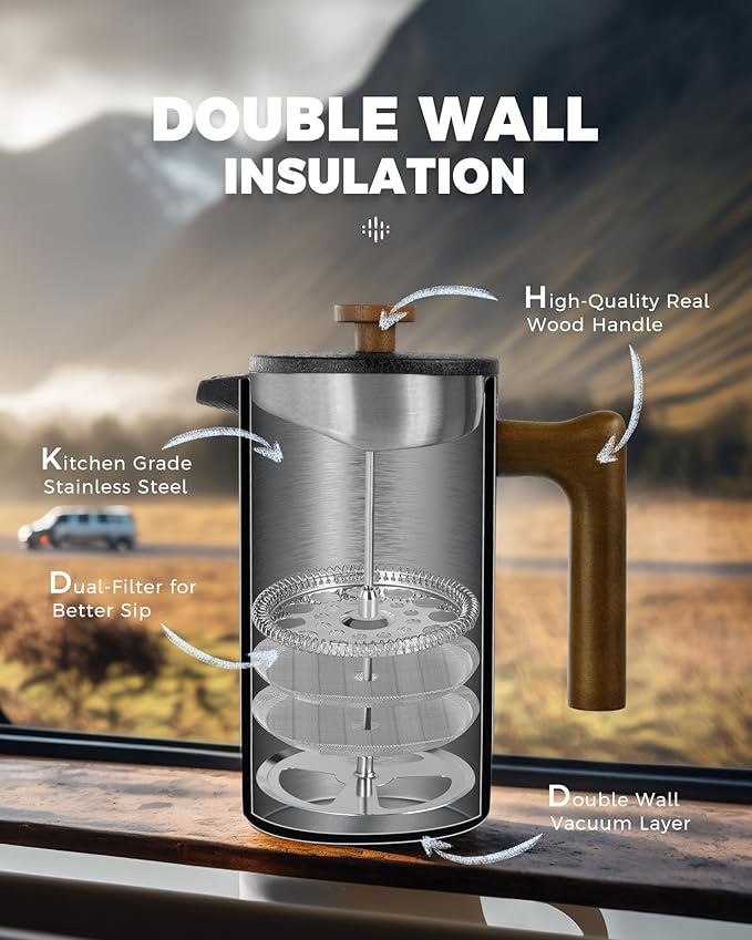 POLIVIAR French Press Coffee Maker, 34 oz Coffee Press with Real Wood Handle, Double Wall Insulation & Dual-Filter Screen, Food Grade Stainless Steel for Good Coffee and Tea JX2023-FPLB