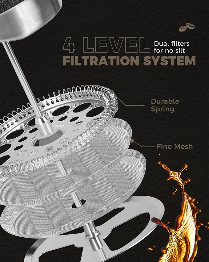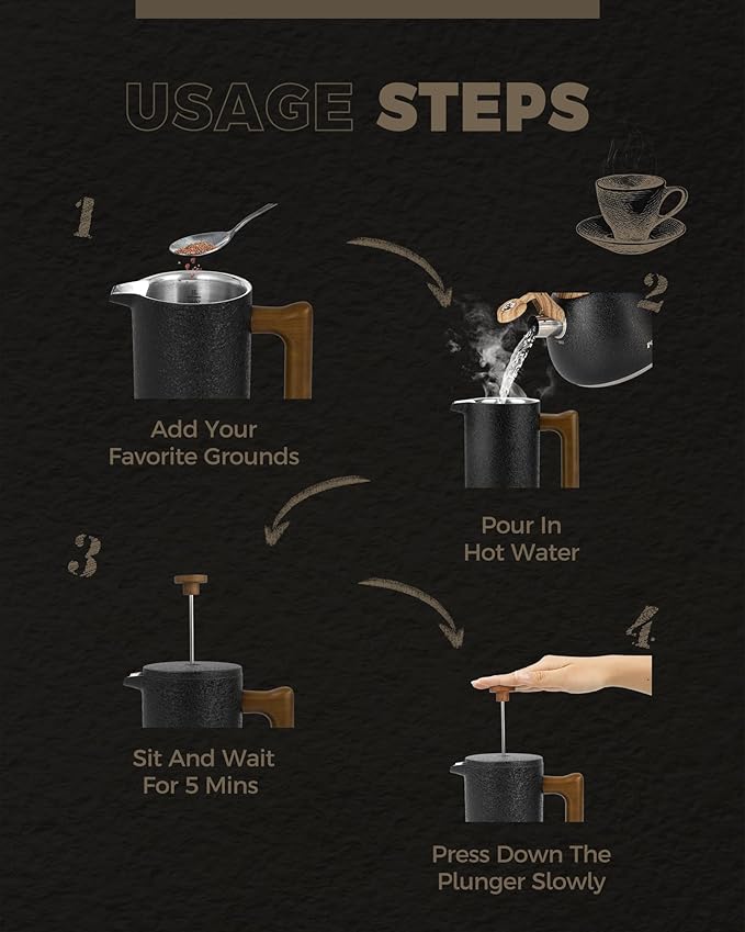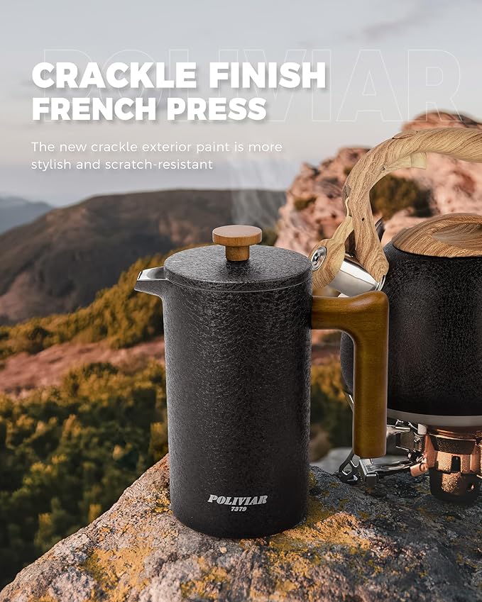 - LOOKING FOR COFFEE PRESS FOR MATCHING UP YOUR KITCHEN? We, the POLIVIAR french press coffee maker will be your smart choice. While the coffee pot is made from food grade stainless steel with stylish long-lasting coating, It is easily to match up your kitchenwares and your kitchen's theme. Also, the ergonomic handle with real wood will maximize the fantastic time of grounds you loved.