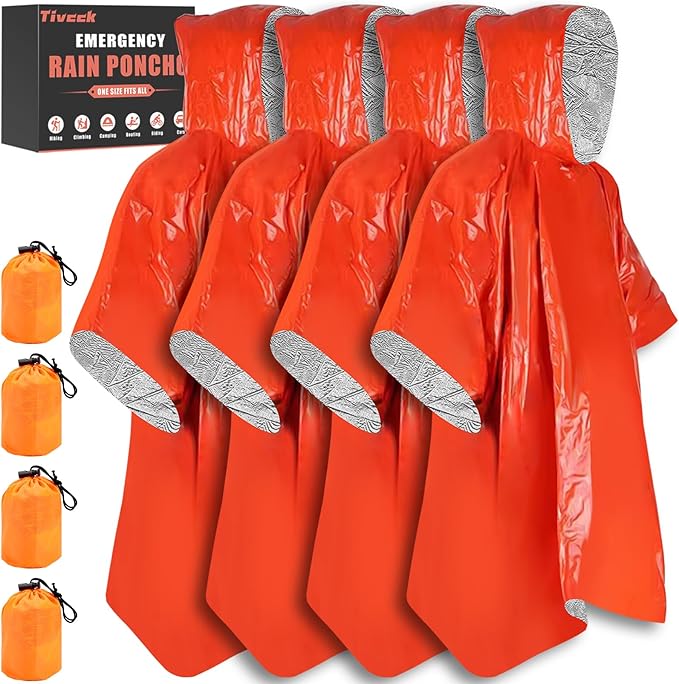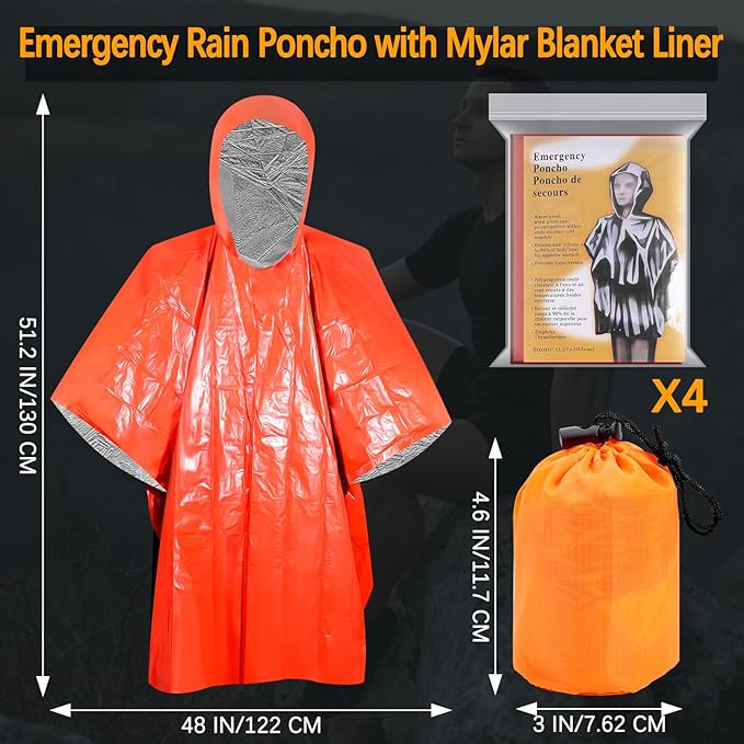 Blcculi 4 Pack Emergency Rain Poncho with Mylar Blanket Liner, Thermal Poncho Survival Blankets,Waterproof Emergency Thermal Blanket for Survival Gear,Camping,Hiking,Outdoor,Heavy Duty (Orange)