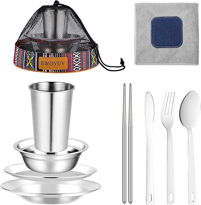 - EWOVUV Single Person Dinnerware Mess Kit set includes 8.5" dinner plate+8" Grill Plate + 10 oz cup + 6" bowl + 7" spoon + 7" fork + 7" knife +7" chopsticks Towel Mesh Bag.