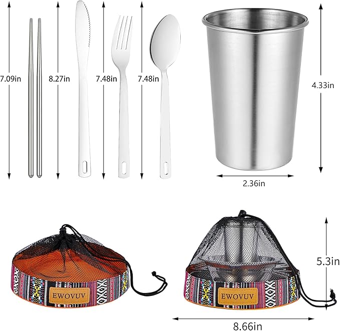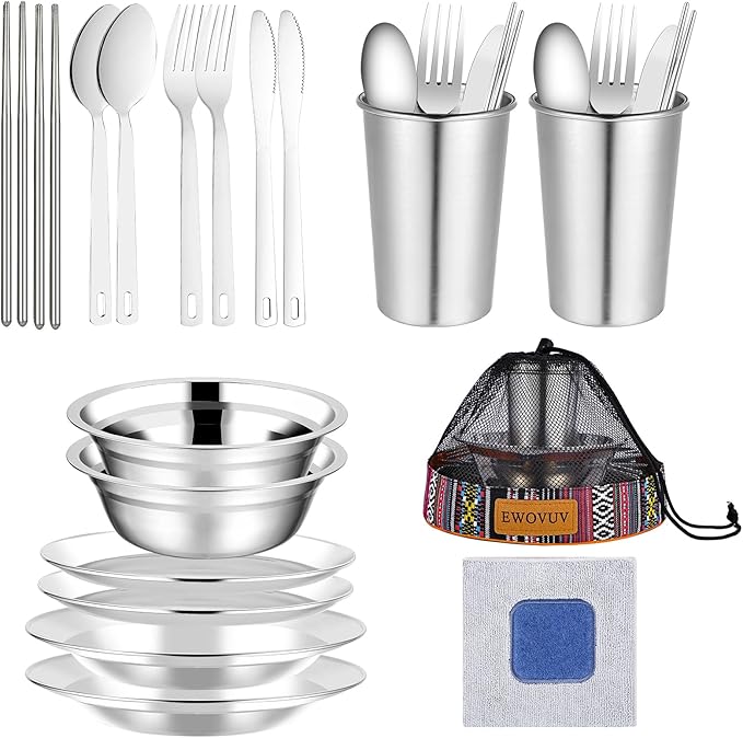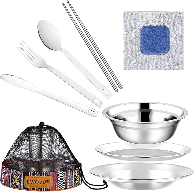 - EWOVUV Double Cutlery Set includes 8.5" Dinner Plates *2+ 8" BBQ Plates *2+ 10 oz Cups *2 + 6" Bowls *2 + 7" Spoons *2+ 7" Forks *2 + 7" Knives *2+ 7" Chopsticks *2 Towels *1 Mesh Bag.