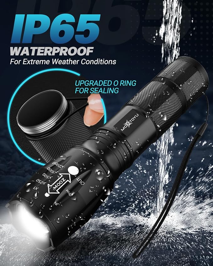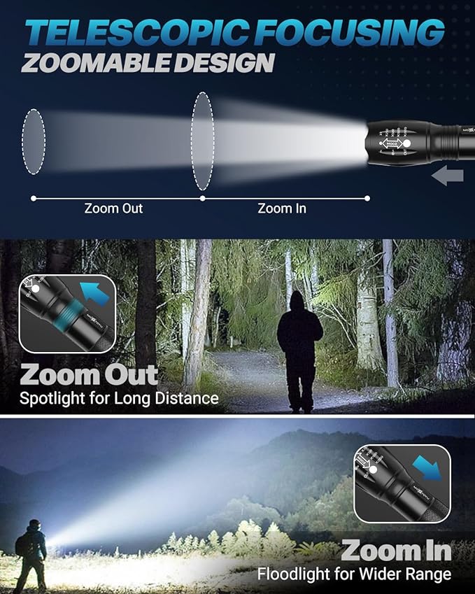 - Zoomable and Multi-Mode : Choose from five different modes on our LED flashlight, including low, medium, high, SOS, and strobe. Whether you are camping, hunting, hiking, biking, or facing a power outage, these versatile modes have got you covered. The adjustable focus allows you to switch between a spot and flood beam, providing a clear view of your surroundings.