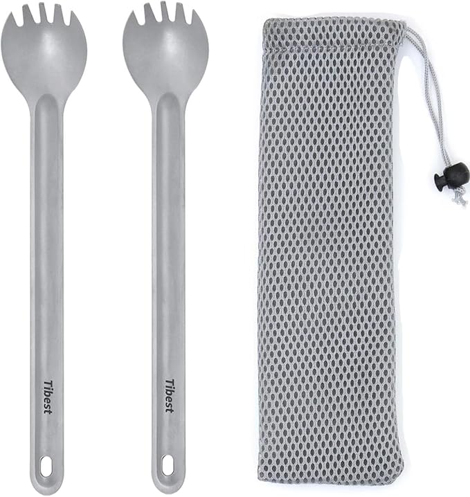 - What You Get: Titanium spoon long handle, Titanium spork and a mesh carry bag.