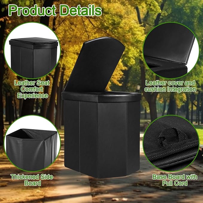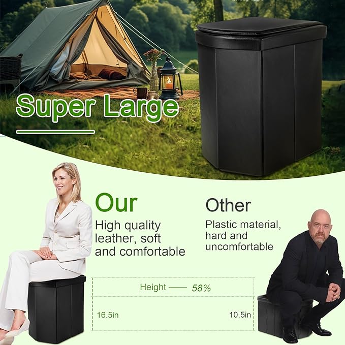 - New Upgrade:The newly upgraded outdoor toilet is made of sturdy density board and high-quality leather, which is skin-friendly and soft . The newly designed drop-shaped toilet is just like the one in your home. And the seat has more sitting room than the round or square travel toilet. Providing you with a comfortable experience, feeling sit on your home toilet when outside Compared with the cold plastic, it is softer and more comfortable, giving you the comfort of home,suitable for the whole family