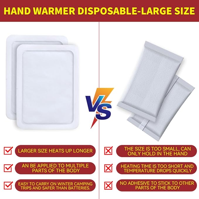 - DISPOSABLE LARGE BODY WARMERS MULTIFUNCTIONAL: These hand warmers are versatile companion for your winter adventures. Whether you're hiking, skiing or just being outdoors, our warm gloves will keep you cozy in the cold. They are a true winter essential and belong in every outdoor enthusiast's gear bag.