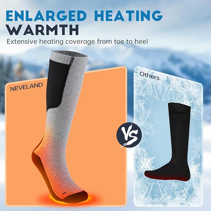 - 【Upgraded Heating Area】- Compared to traditional electric heated socks, the Neveland heated socks for men and women feature invisible heating area with precise stitching and soft embedded heating elements, distributed in the ball of the foot, toe and ankle area, heat quickly and you can feel the temperature in 30 seconds. Just connect the battery, then adjust the temperature level through the remote control.