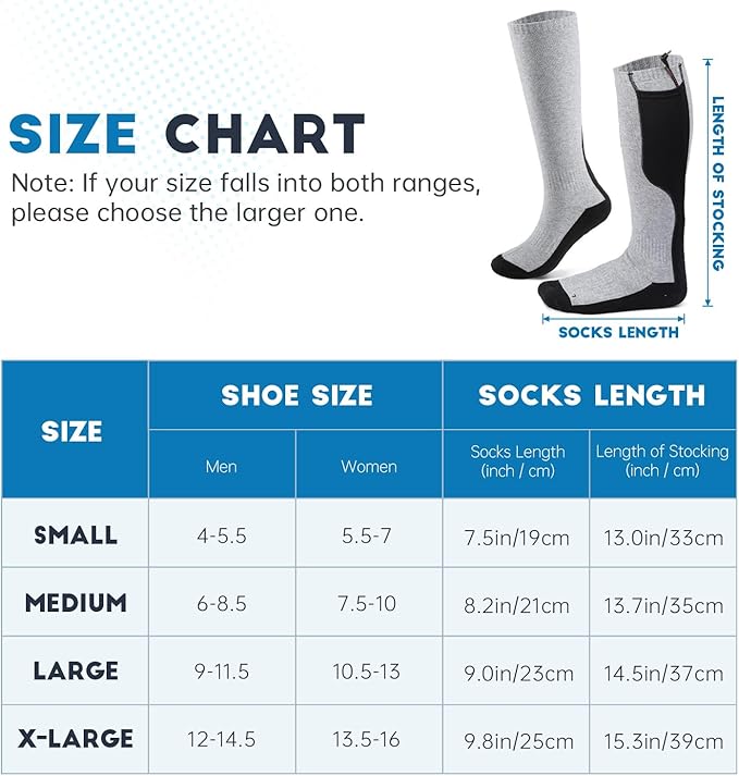 - 【Best Gift Choice】-The heated sock is suitable for many winter outdoor activities such as skiing, hiking, fishing, hunting, biking, and more. Not only can they help keep your feet warm, but they can also promote blood circulation and reduce soreness. They make the best gift choice for your family and friends, providing warmth to the people you love.