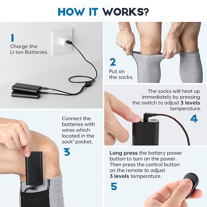 - 【What You Get】- IMPORTANT NOTICE: The battery must be paired with the remote control provided, otherwise it will automatically shut down within 10 - 30 minutes, please follow the pairing instructions. 1 pair of socks, 2 x 5V Li-ion batteries, 1 charger, 1 remote control. If the socks do not meet your expectations or you have any questions about the quality, please feel free to contact us - we are always here to support until the problem is fully resolved.