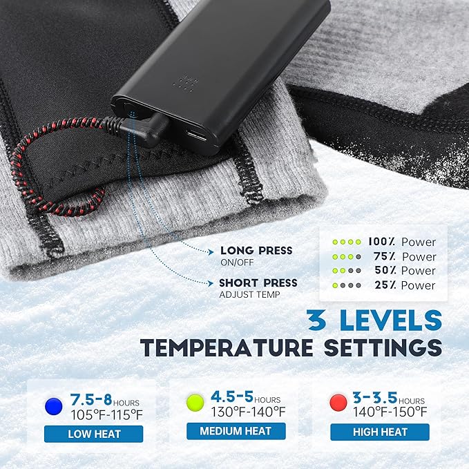 - 【3-Settings Temperature Controller】- Equipped with a remote control, paired with two 4000mAh Li-ion batteries, which can be fully charged in about 4 hours, this pair of heated socks has 3-level temperature settings. High-Red: 140℉ - 150℉ for 3-3.5 hours; Medium-Green: 130℉ - 140℉ for 4.5-5 hours; Low-Blue: 105℉ - 115℉ for 7.5-8 hours. They keep your feet nice and warm in cold weather.
