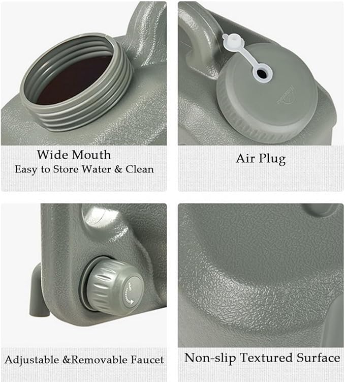 - This water tank is suit for camping since it has all the openings on the top, which makes it easier to carry in the van without spilling. It comes with it's own pour spout with a on/off knob. Water output can be adjusted according to demand, very water-saving.