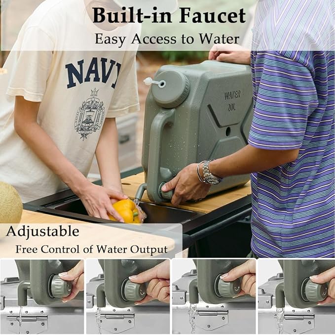 - This water tank is suit for camping since it has all the openings on the top, which makes it easier to carry in the van without spilling. It comes with it's own pour spout with a on/off knob. Water output can be adjusted according to demand, very water-saving.