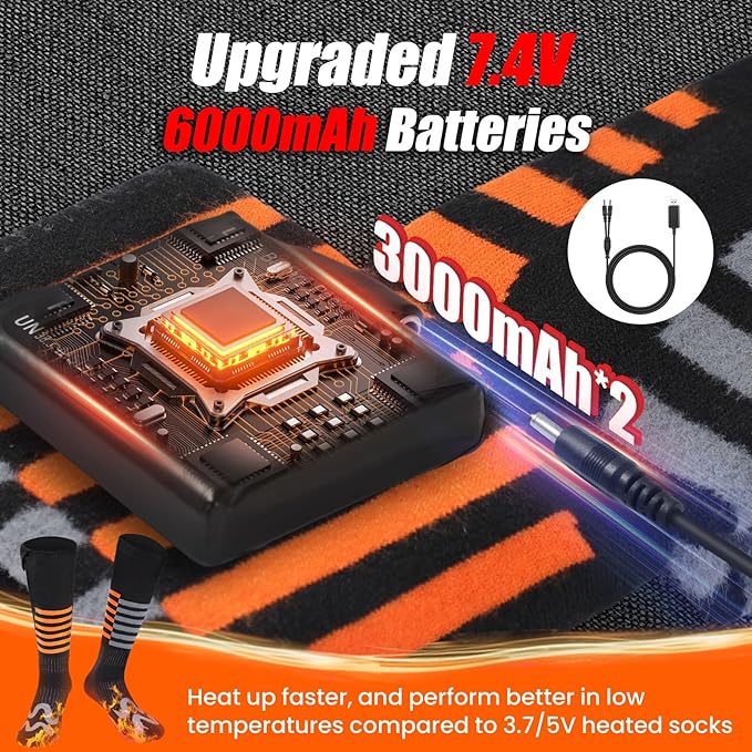 - 🔥【Enhanced 7.4V/3000mAh Heated Socks】The heated socks come with a pair of 7.4V 3000mAh rechargeable batteries. Unlike 3.7V and 5V heated socks, our electric socks provide faster and more stable heating performance and excel at low temperatures. 10 hours of lasting time (at low level and fully charged). The heated ski socks also come equipped with an Extended double-ended charging cable for easy charging and durability. Elevate your comfort this winter with our advanced heated socks.