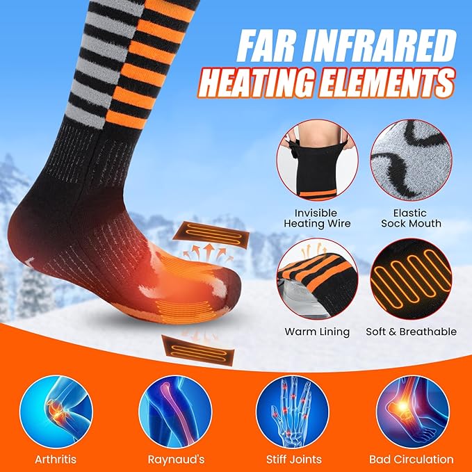 - 🔥【Ideal for Winter Outdoor Indoor Use】 These winter foot warmer socks are super soft, cozy, breathable, quick-drying, and elastic-thicken. Heating socks can keep your feet warm, promote blood circulation and reduce soreness. The rechargeable heated socks are your go-to choice for hunting, skiing, camping, fishing, hiking, motorcycle, skating, or snowboarding. Say Goodbye to cold feet and enjoy the winter outdoors to the fullest!
