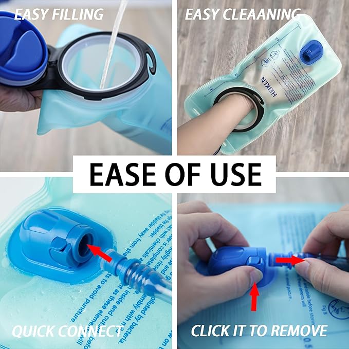 • LARGE-DIAMETER OPENING DESIGN : HEIKLN 2l hydration bladder has one of large opening, and the big opening makes for easy pouring of water. It is also fairly wide for a hand or bottle brush easily access to the interior water bladder. The screw on cap goes on and off easily. For cold water, simply add ice cubes directly from a scoop or refrigerator ice dispenser. The smooth inner of water reservoir promotes health and is easy to clean.