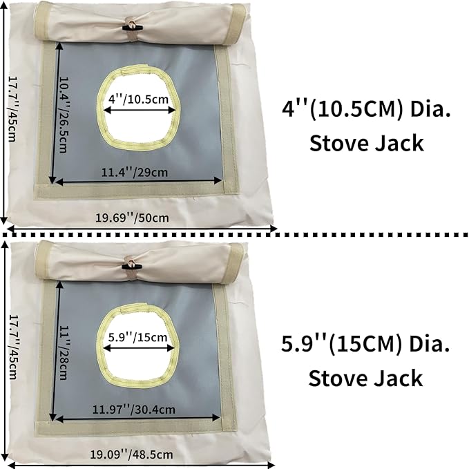 - SIZE OF STOVE JACK: Round hole Dia. :4’’. The size of stove jack is 19x19.5 inches.(Have the extra canvas around the outside to glue and sew in)Grey rectangle size:11x11.5 inch. Thickness: About four A4 papers