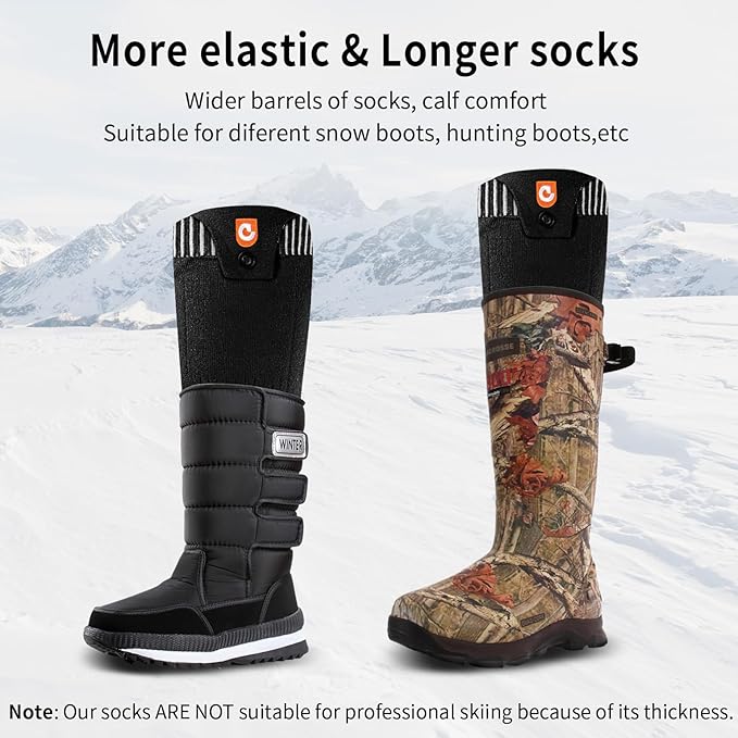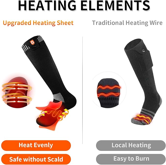 - Extra Large Capacity Batteries: Our heated socks are equipped with two 5000 mAh rechargeable batteries, the battery capacity is more than double of other heated socks available on the market, and the batteries are light in weight and can be used for a long time without frequent recharging. The extra-long battery life can meet your needs of keeping warm for a long time outdoors, and the large-capacity rechargeable battery electric heater socks are perfect for long trips and outdoor sports.