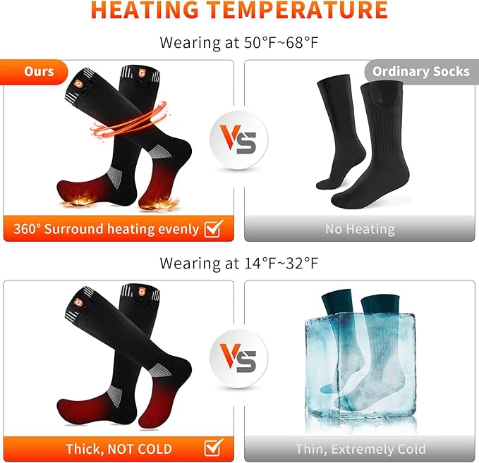 - High Quality Warm Fabric: Heating socks are designed with 4 layers of fabric, the electric heating wire is hidden in the fabric and integrated with the socks, 360° wrapping the foot area, no foreign body feeling and comfortable to wear. Surround heating to make your feet and even your whole body maintain warmth. The battery sock fabric is also very flexible and long enough.