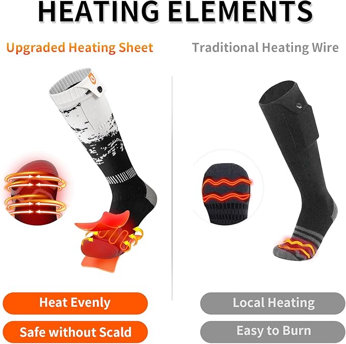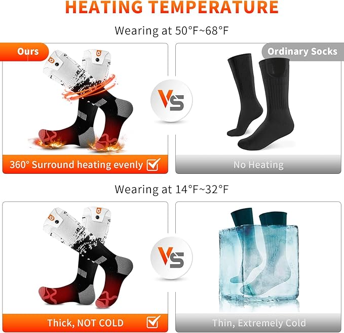 - High Quality Warm Fabric: Heating socks are designed with 4 layers of fabric, the electric heating wire is hidden in the fabric and integrated with the socks, 360° wrapping the foot area, no foreign body feeling and comfortable to wear. Surround heating to make your feet and even your whole body maintain warmth