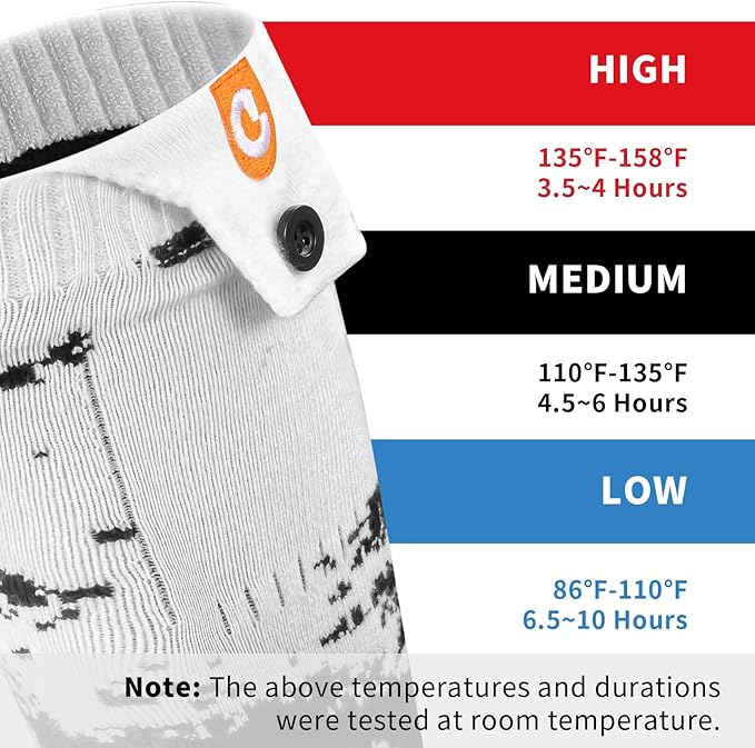 - Extra Large Capacity Batteries: Our heated socks are equipped with two 5000 mAh rechargeable batteries, the battery capacity is more than double of other heated socks available on the market, and the batteries are light in weight and can be used for a long time without frequent recharging. The extra-long battery life can meet your needs of keeping warm for a long time outdoors, and the large-capacity rechargeable battery electric heater socks are perfect for long trips and outdoor sports