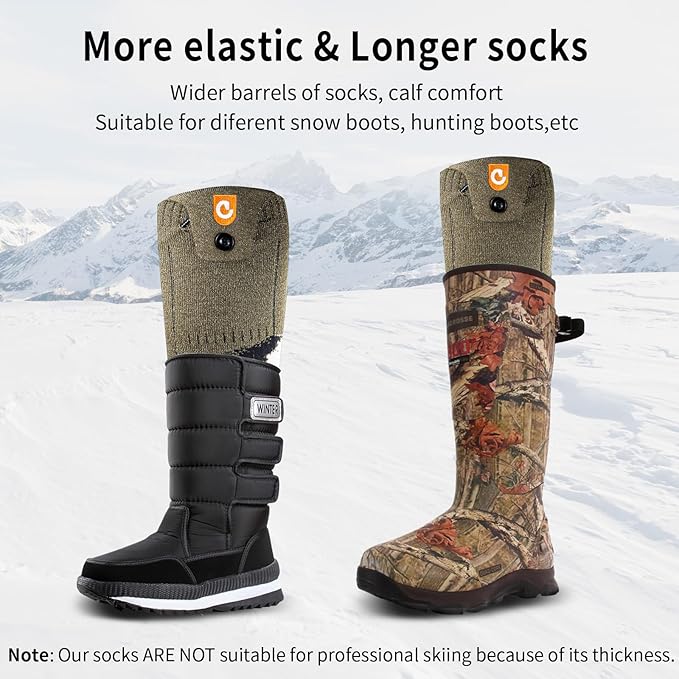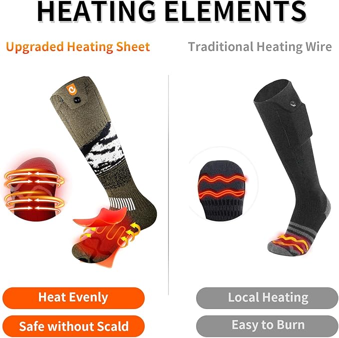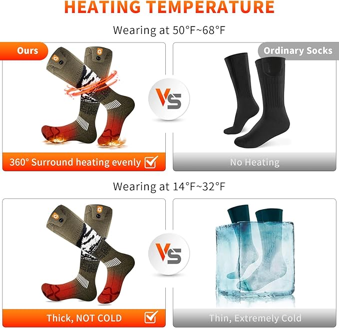- One Size Fits Most: Our heated socks size is about 23.6-26.8 inches. Please refer to our size chart before you order. And our heated socks are suitable for US size 7-13 for men and US size 9-12 for women