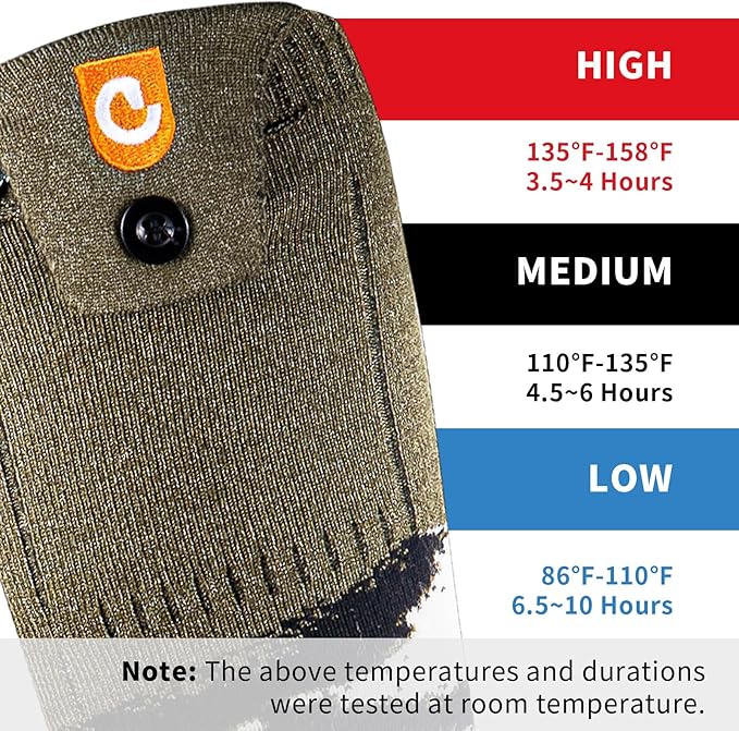 - 5000mAh Battery: Upgraded 5000mAh large capacity rechargeable battery, provide more than 12 hours of heat time for men’s heated socks and about 10 hours for women’s heated socks, please charge it fully before first using it