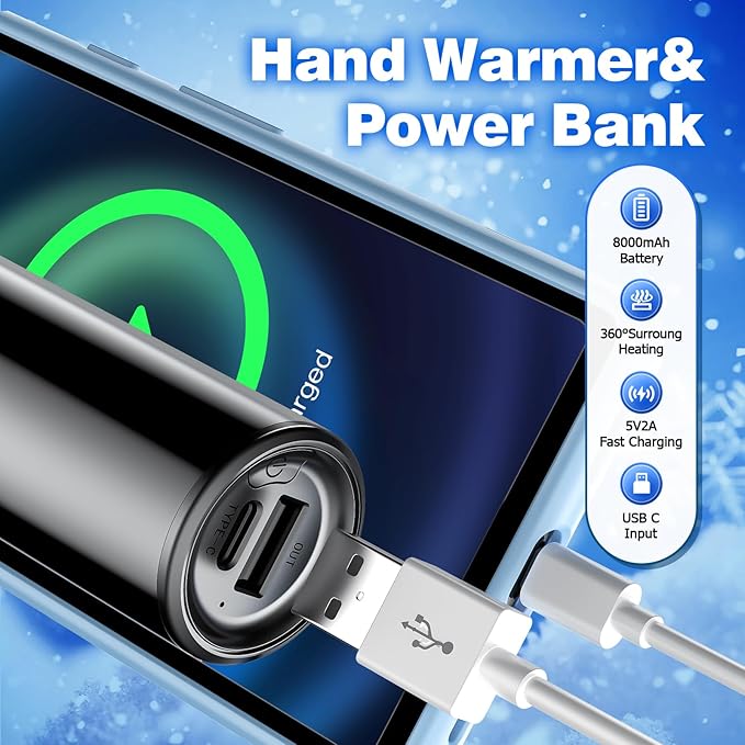 - 🔥【Long Battery Rechargeable Life 】The electric hand warmer With a 8000mAh lithium rechargeable battery, a single full charge take 2.5 hours will warm last for 8 hours, can warm you all night. With the USB C port, you can use your hand warmer to charge your phone, electronic devices on the go.