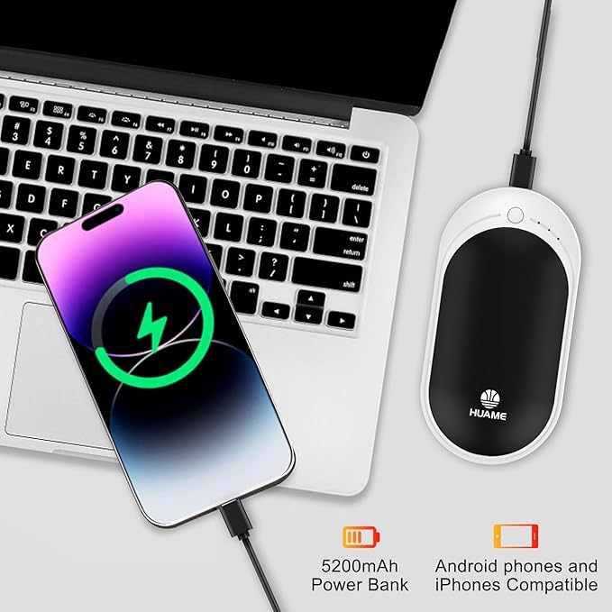 - 【5200mAh Power Bank & Hand Warmers】- The portable hand warmers built-in 5200mAh rechargeable battery, when fully charged, can provide 4-8 hours of heat for your hands or charge your phone about 2-3 times, making it a reliable portable power source when you're outdoors in winter