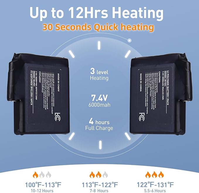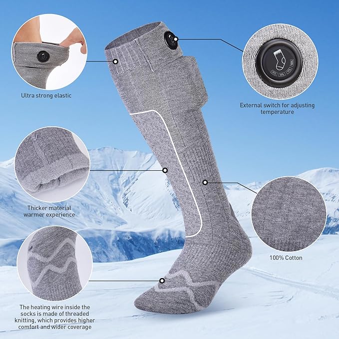 - 【Longer Heating Time】The electric heating socks used 7.4V 6000mAh lithium polymer rechargeable battery. The battery capacity is larger than others products and the voltage is more stable.The heating time will longer than 3.7V&5V heated socks and the temperature will be more stable.