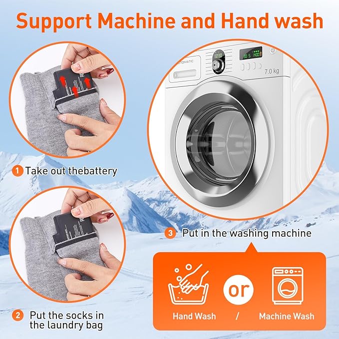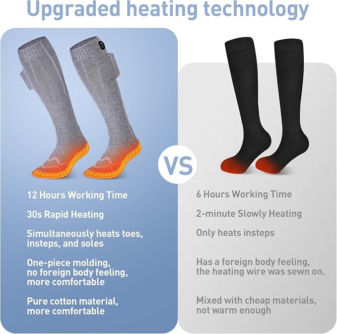 - 【New Production Process and Wider Heating Area 】We have upgraded the manufacturing process of socks, enlarging the range of heating surfaces, which can warm the toes and the top of the feet and improve comfort. Electric heating socks are made of high-quality polyester mixed fiber, which is soft, breathable, elastic, and skin-friendly.