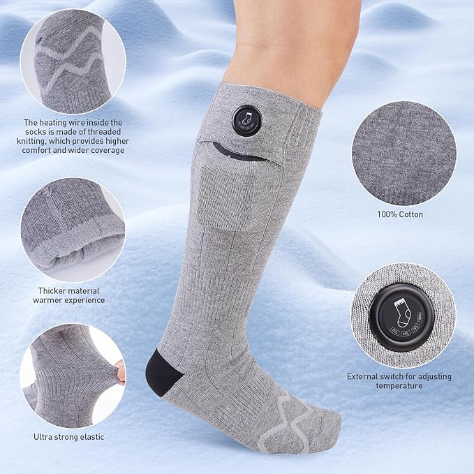 - 【Longer Heating Time】The electric heating socks used 7.4V 6000mAh lithium polymer rechargeable battery. The battery capacity is larger than others products and the voltage is more stable.The heating time will longer than 3.7V&5V heated socks and the temperature will be more stable.