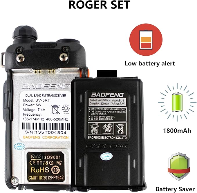 - 【Professional Baofeng UV-5RT Full Set】All You Need Is In One Box!Package contents include:5W Portable Radio ,PL2303 Programming Cable,1800mAh Li-ion Battery(long standby),US Base Charger , Belt clip ,The sling ,Earpiece,User's manual