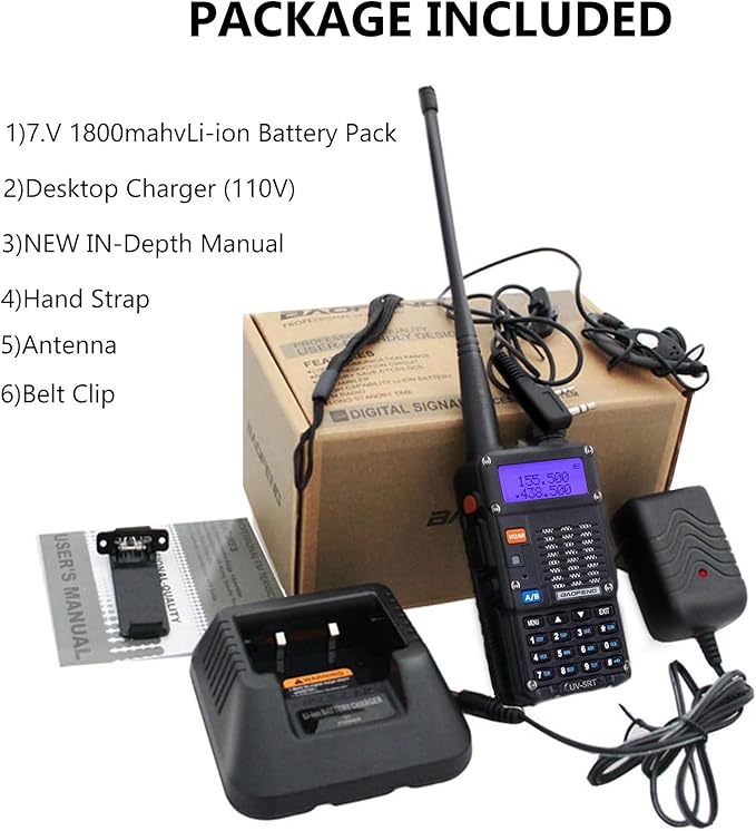 - 【What's in the box】BAOFENG UV-5RT radio with antenna, 1 x 1800mAh Li-Ion battery, 1 x Headset, 1 x Desktop charger, 1 x Belt clip, 1 x Hand strap, 1 x English manual.