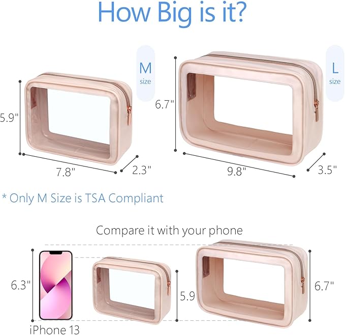 - TSA Approved Hassle-Free Pass: Adhering to TSA 3-1-1 rules for liquids, our clear travel bags (8.07 x 2.35 x 5.91 inches) promises a swift stroll through airport security. For items unfit for carry-on, the large-sized travel clear bag (9.84 x 3.54 x 6.69 inches) is perfect for checked luggage
