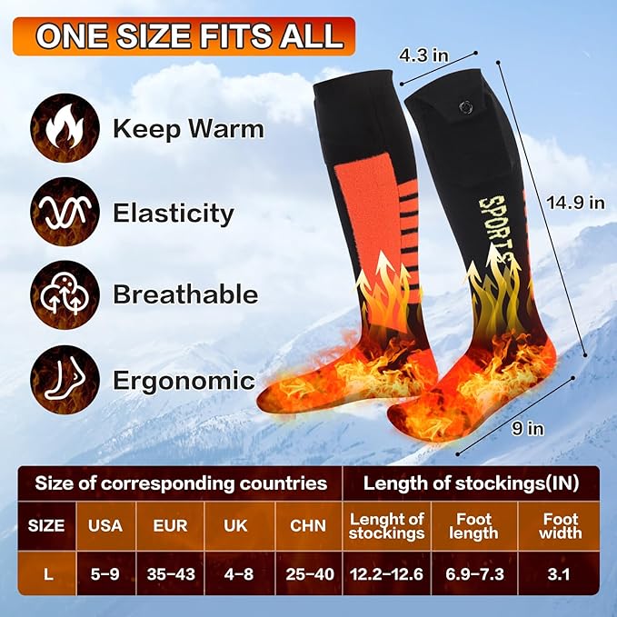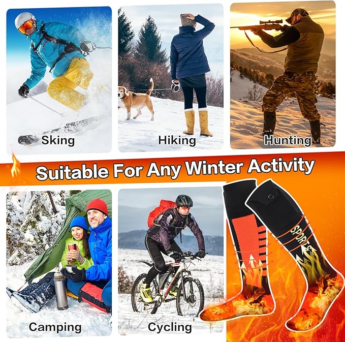 - √【Best Gift】 One size fits all(US 5-12,EU 35-50, UK4-11). Our heated socks are perfect for both men and women, whether indoors or outdoors. They are ideal for activities like cycling, motorcycle riding, hunting, fishing, camping, skiing, hiking, providing instant warmth and comfort to your feet.Give the gift for your family and friends this winter!