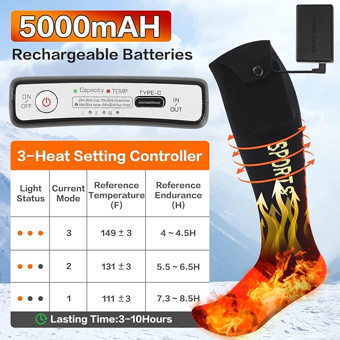 - √【5000mAh Rechargeable Battery for fast heating】: Our Heated Socks women are equipped with two 5V 5000 mAh rechargeable batteries.these large-capacity battery electric heating socks provide long-lasting warmth for 3-10 hours. Our electric socks come with the latest Type-C interface to provide fast charging ,very lightweight design.Rechargeable battery socks ensure worry-free outdoor adventures,enjoying outdoor time without cold!