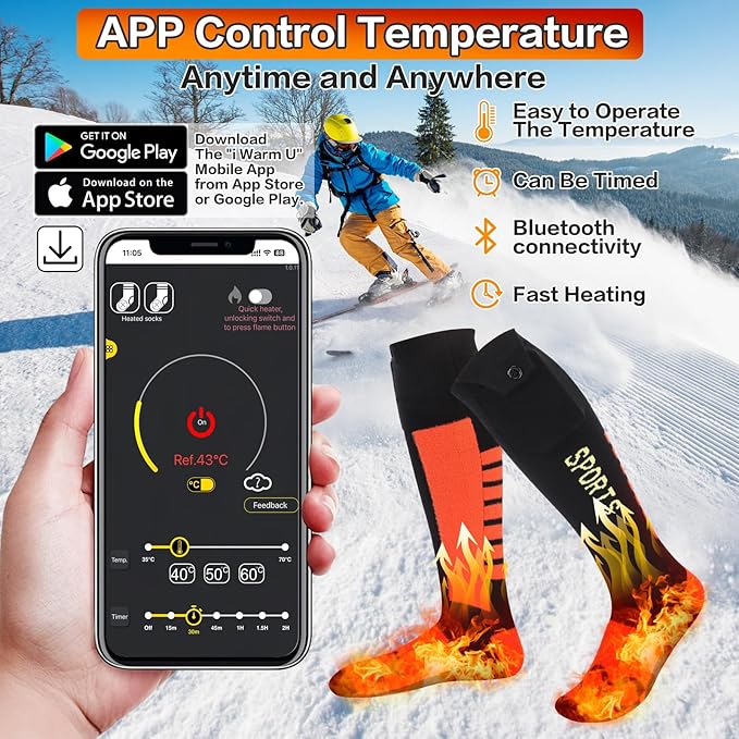 - √【Upgrad Intelligent APP Control Heated Socks】:Our upgraded electric socks come with an intelligent app that allows you to easily adjust the switch, temperature, and time.Just simply scan the QR code in the manual and download the "i Warm U" app on the phone for effortless control the electric heated socks anytime, anywhere. No more bending down or taking off your shoes to find the button inside the electric heating socks - Make your outdoor activities more convenient and enjoyable.