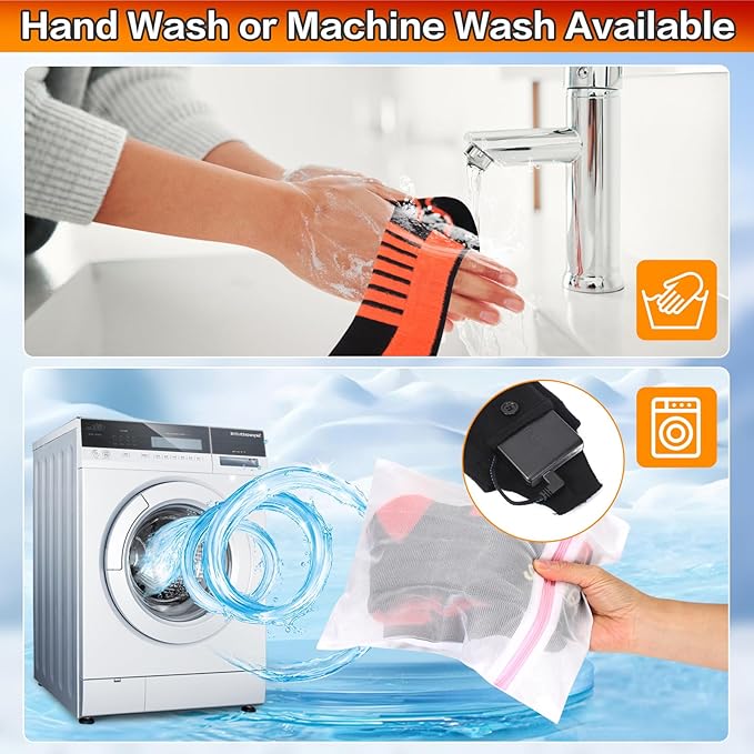 - √【Comfortable and washable】: Our electric socks with ergonomic curve design, which is breathable, quick drying, elastic, soft and durable. Heated socks for men women are made of high-quality materials that can absorb sweat. They are not only comfortable to wear but also keep warm.They can be hand washed or machine washed. Before cleaning, make sure to remove the battery.Put the heating socks in the laundry bag(included in the packaging) before placing them in the washing machine.
