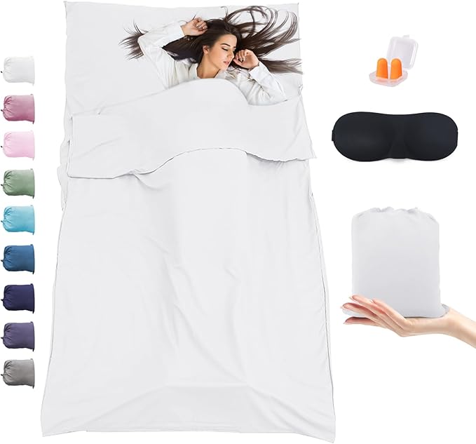 - 🧼Integrated Pillow Sleeve:The sleeping bag liner with zipper features a convenient pillow pocket that allows you to stuff your own jacket for a cozy pillow while camping. When traveling, you can use the pocket to keep the hotel pillow separate for a more hygienic sleep.