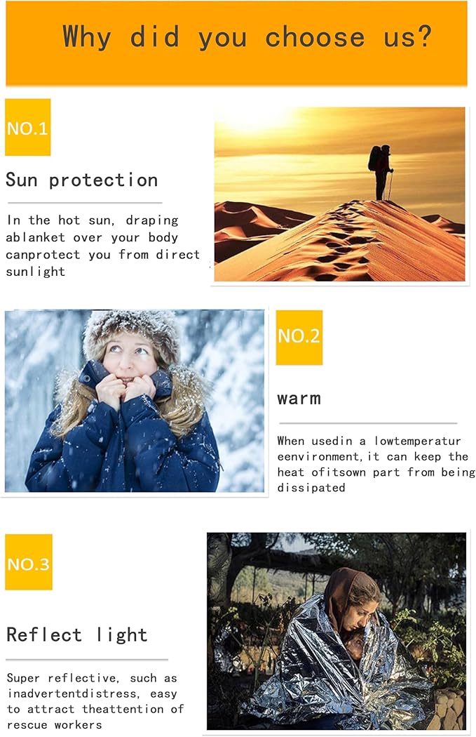 - High-quality Material: The camping emergency blankets is made with Mylar material. Mylar has insulating properties and can reflect/retain 90% of human body heat. The emergency survival mylar thermal blankets ensuring reliable protection in harsh outdoor environments.