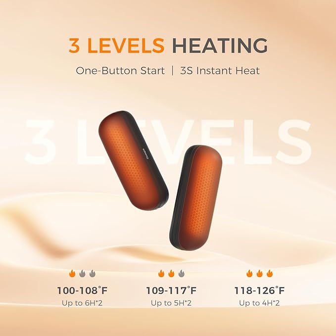 - Instant Heat, Lasting Warmth: Heat release in just 3 Seconds, 3 temperature settings up to 126 °F, Heat duration up to 4 to 6 hours; We offer a split USB-C charging cable, saving you charging time and allowing you to enjoy more warmth