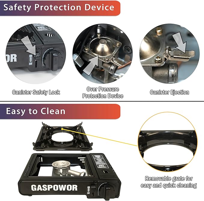- 🔥【Easy-to-Use and Clean Camping Stove】GASPOWOR butane camping stove is safe and easy to use, even for novices. The porcelain-coated grate of the gas stove is removable, allowing for quickly cleanup, and the aluminum burner is resistant to rust.