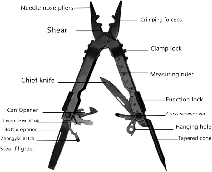 - Function: 1. Main knife 2. Bottle opener 3. Can opener 4. Taper 5. Double-sided file 6. Cross screwdriver 7. Flat-head screwdriver 8. Flat-head screwdriver (thin) 9. Measuring ruler 10. Circle Hole 11. Needle-nose pliers 12. Detonator crimping pliers 13. Wire removal pliers