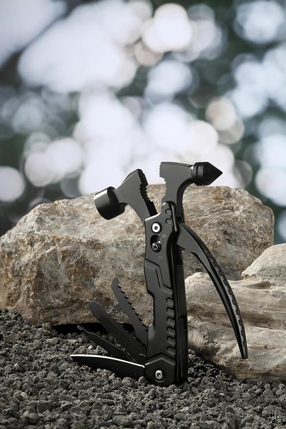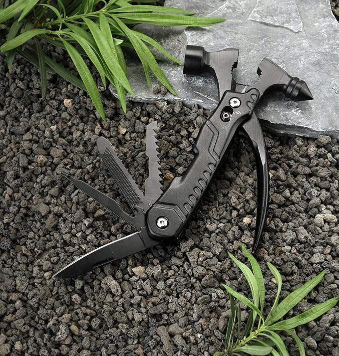 - PORTABLE MULTI-TOOL 14-in-1 - Our pocket hammer multitool has a nail puller, flat pliers, grip pliers, wire cutters, hammer, serrated knife, flathead screwdriver, nail file, fish scaler, scale cm/inch, bottle opener, screwdriver, knife.
