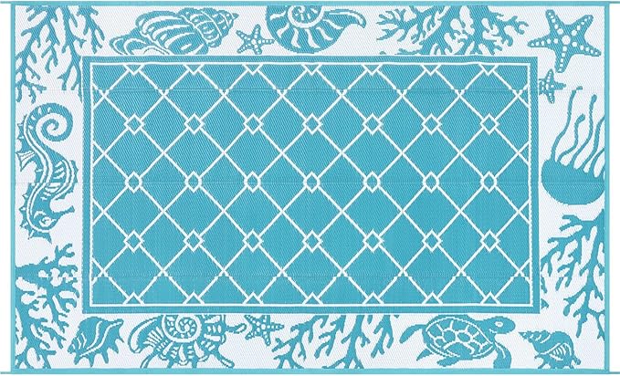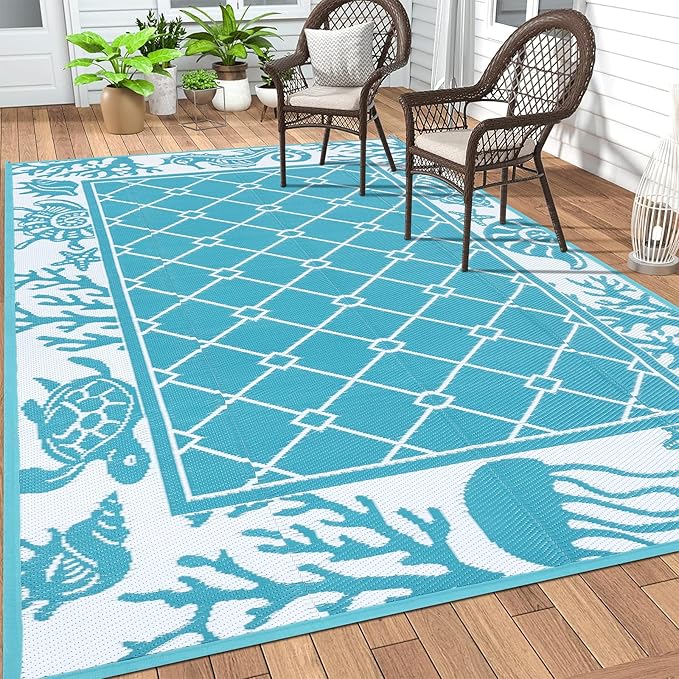 Vaukki Reversible Rugs, Plastic Straw Outdoor Doormat, Fade Resistant Plastic Outdoor Patio Mat, Lightweight Ocean Area Carpet for Patio, RV, Camping, Beach, Deck, Backyard and Picnic (Teal, 5'x8')