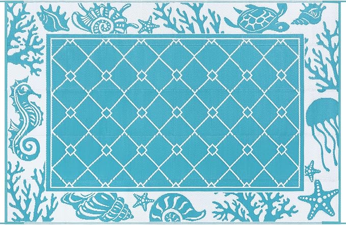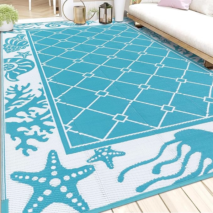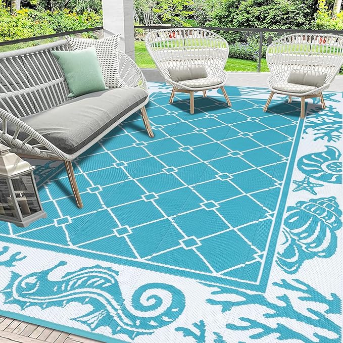 Vaukki Reversible Rugs, Plastic Straw Outdoor Doormat, Fade Resistant Plastic Outdoor Patio Mat, Lightweight Ocean Area Carpet for Patio, RV, Camping, Beach, Deck, Backyard and Picnic (Teal, 6'x9')