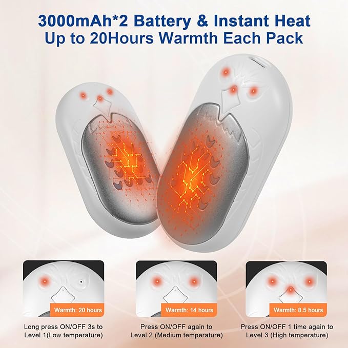 - Long Lasting Warmth with 6000mAh Battery: Built in 3000mah*2 battery, this rechargeable hand warmers can last up to 20hours warmth for double pack usage, and up to 40hours for single pack usage. Bring you continuous warmth throughout the day