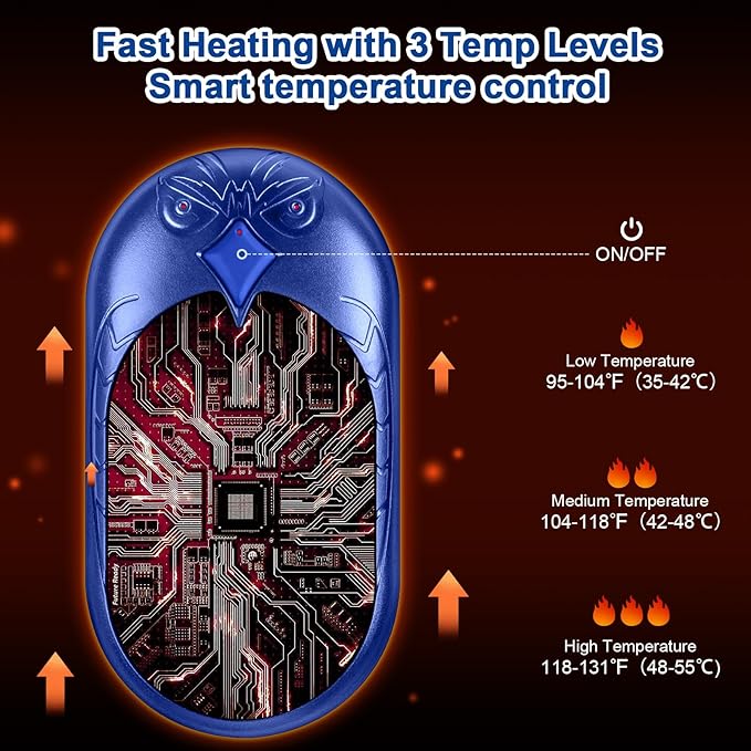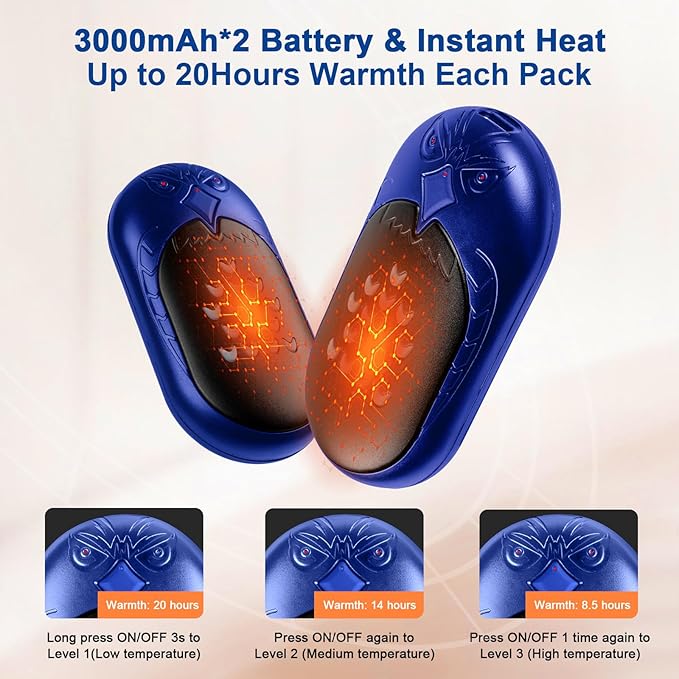 - 3 Heat Levels & Smart Temperature Control: Our portable hand warmers can be adjusted freely to low/medium/high heating level to meet your demands. Feature with smart temperature control system, can give you suitable and comfortable feeling for hands, warm you and care you