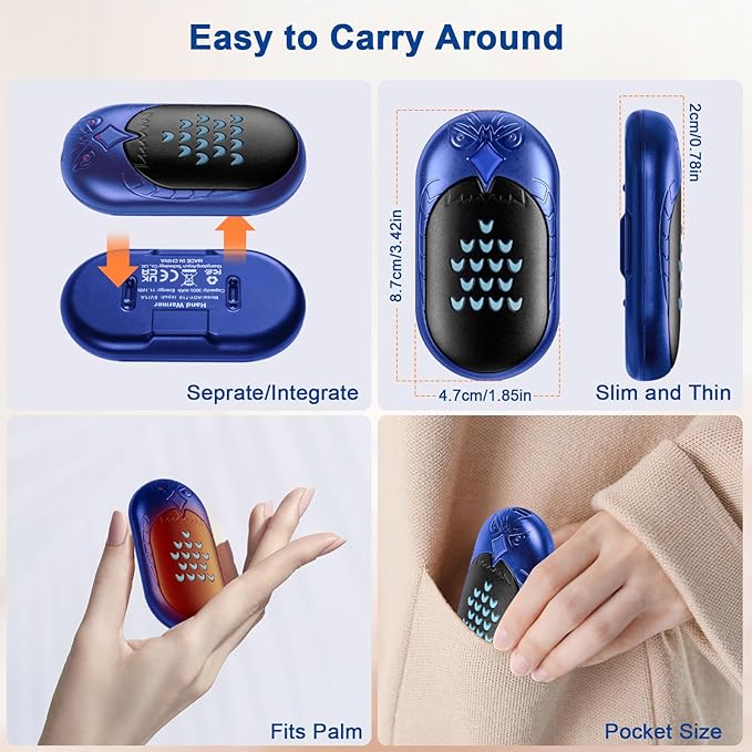 - Double-Sided Heating: Unique 2 Pack rechargeable hand warmers, can be separated or interated to use. Keep your two hands warmth at the same time in the cold winter. An essential companion for your winter travels and various activities, also can share warmth with families, friends, boyfriend, girlfriend, etc.