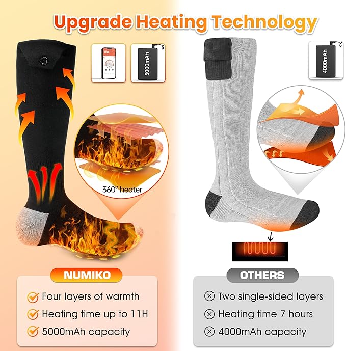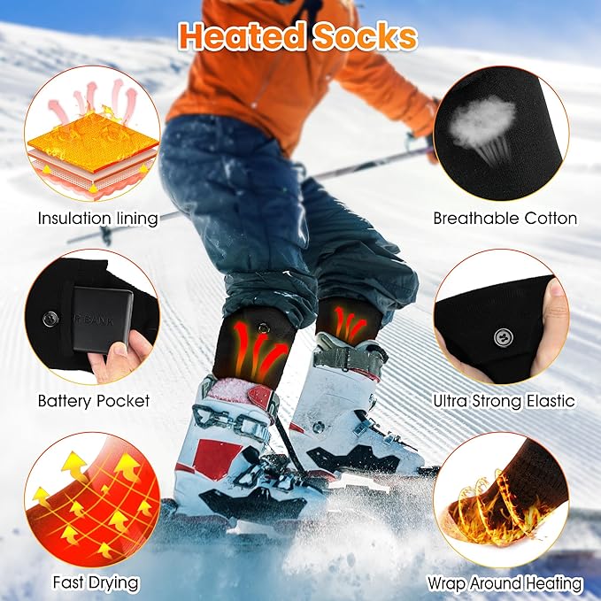 - [Wrap Around Heating] 3D hidden loop heating wire spreads inside the fabric, covering the whole toe area. Electric heated socks heat within 20 seconds evenly, resulting heat in larger area and promote blood circulation. For people who are adventurous and outdoorsy, it is the best choice to keep you warm in this cold winter.