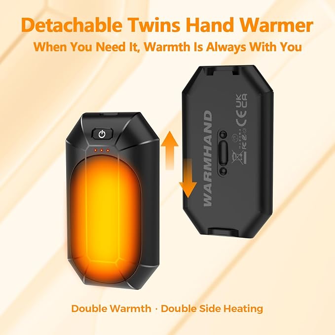 - [2023 Hand Warmers Rechargeable, Double the Coziness] Warm up in an instant with our 2023 hand warmers rechargeable, providing a cozy embrace for both hands for up to 16 hours. Whether synthesized into one unit or used separately, switch effortlessly to suit the scene. Combine them for all-around warmth, extending from palm to fingertips. Alternatively, use them independently to warm both hands simultaneously. The consistent release of warmth ensures you stay toasty throughout the winter.